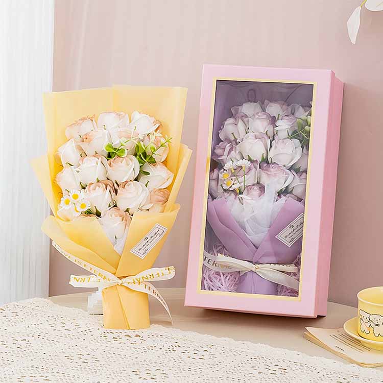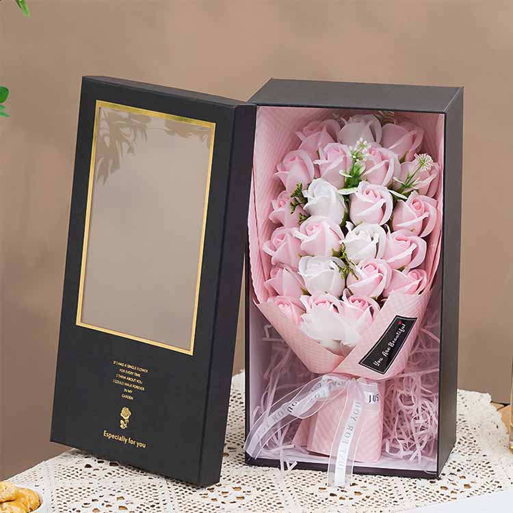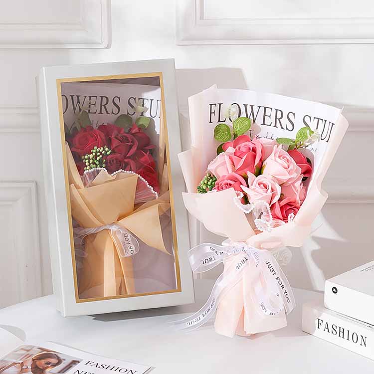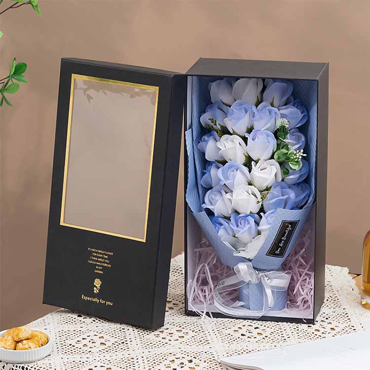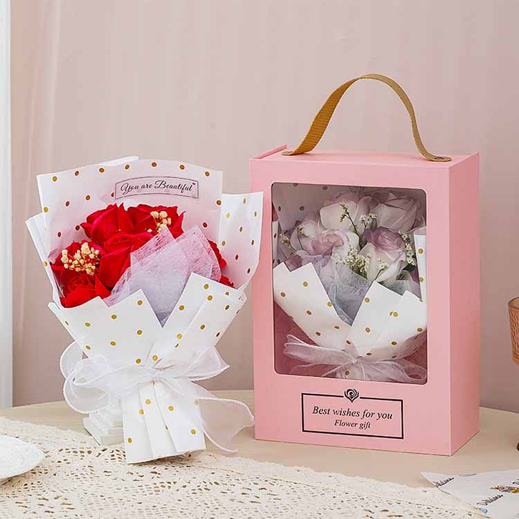 Kotak kado buket memiliki stempel panas, pinggiran transparan, dan bahan timbul, yang dapat membuat bunga lebih berlapis dan mewah. Bahan yang digunakan adalah karton, laminasi dan bahan ramah lingkungan yaitu anti tekanan dan anti deformasi. Selama festival apa pun, pelanggan dapat membeli sesuai dengan kebutuhan mereka, yang sangat hemat biaya.