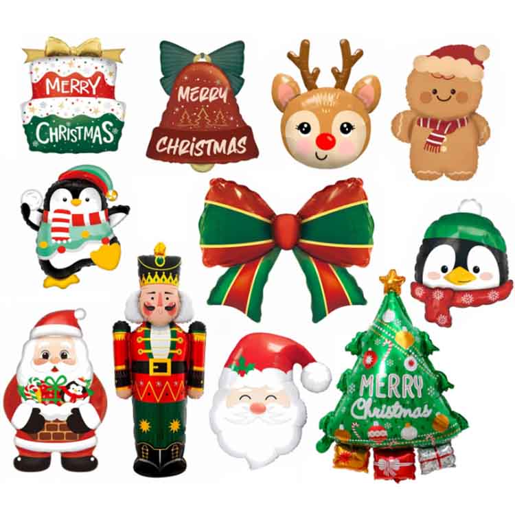 Balon aluminium foil Natal memasukkan elemen Natal dalam desainnya. Tersedia dalam bentuk klasik seperti Sinterklas, pohon Natal, kepingan salju, dan lonceng, balon ini dihiasi slogan "Selamat Natal". Warna-warna tersebut menggabungkan unsur-unsur Natal, terutama menampilkan warna-warna bertema Natal seperti merah, hijau, emas, dan perak, menciptakan suasana meriah. Tersedia dalam berbagai ukuran, dari mini 30cm hingga raksasa 100cm, semuanya memenuhi berbagai skenario dan kebutuhan dekoratif.