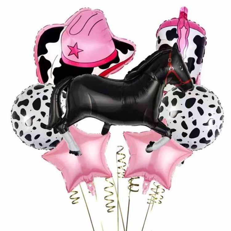 Dengan kontur garis yang tepat dan pencocokan warna, mereka mengembalikan kontur otot dan surai kuda yang mengalir, dan skema warna alami yang umum seperti coklat dan hitam lebih cocok dengan gambar kuda sebenarnya. Beberapa balon foil bertema koboi bahkan menambahkan warna metalik seperti perak dan emas untuk meningkatkan dampak visual; pola sapi berbentuk lingkaran, dengan pola sapi hitam putih tercetak di atasnya, dan beberapa gaya menambahkan beberapa dekorasi tiga dimensi seperti lonceng kecil dan pluekor di bawah balon aluminium foil, yang lucu dan bergaya pedesaan, dan merupakan tema yang sangat populer untuk kegiatan koboi untuk keluarga.