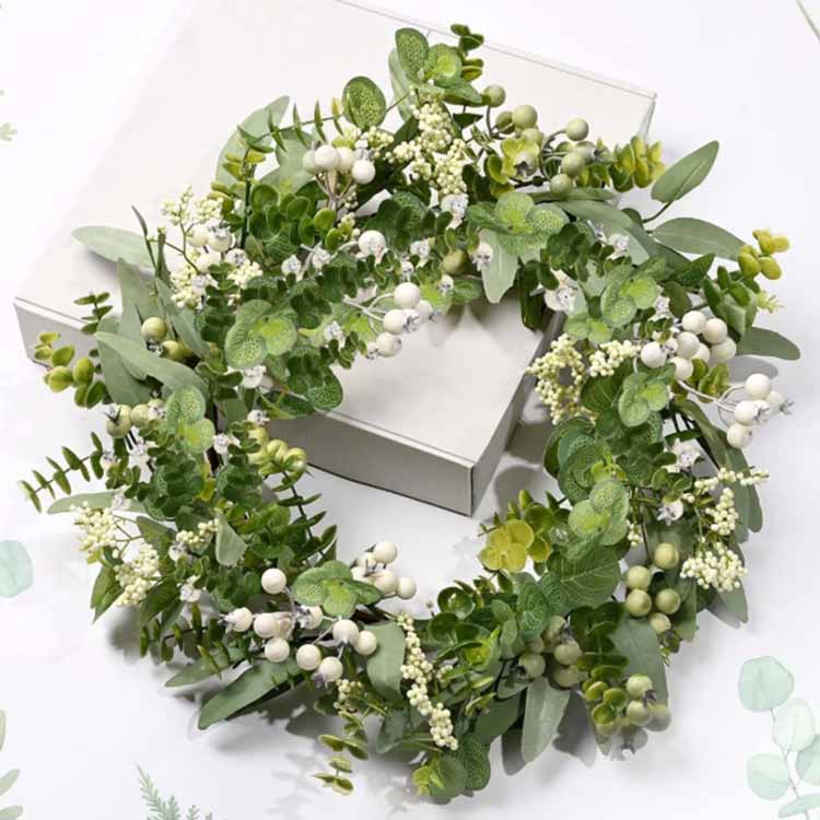 Karangan bunga dekorasi menampilkan daun sebagai elemen utamanya, dengan gaya berbeda bertatahkan bunga berbeda sebagai hiasan, dan bentuk keseluruhannya melingkar. Urat daun terlihat jelas, menciptakan efek seperti aslinya. Dapat menahan radiasi ultraviolet dan tidak akan pudar. Ini adalah pilihan utama untuk mendekorasi bagian depan rumah atau rak perapian selama Natal.