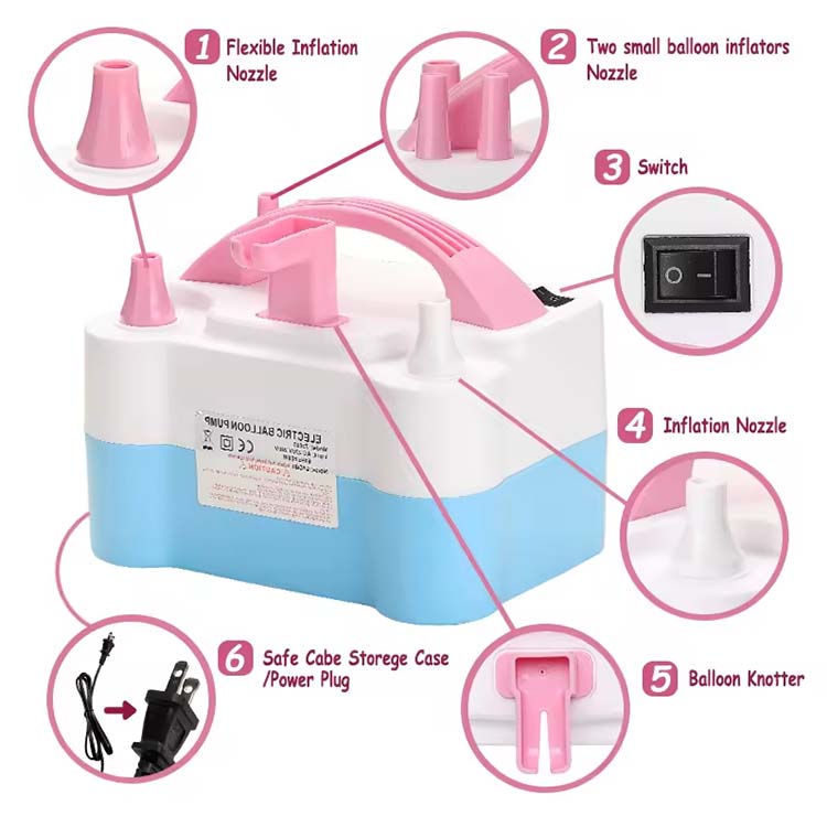 Setelah menggembungkan balon, proses simpul balon sering kali sakit kepala. Itupompa listrik dengan knotter nosel gandasecara cerdik memecahkan masalah ini. Knotter bawaannya dirancang dengan indah dan mudah dioperasikan. Saat menggunakannya, cukup bungkus ekor balon yang meningkat di sekitar knotter ke arah tertentu dan tarik dengan lembut untuk dengan mudah mengikat simpul, menghindari masalah nyeri jari dan kebocoran balon yang mungkin terjadi ketika mengikat simpul secara manual. Bahkan jika digunakan untuk pertama kalinya, itu dapat dengan cepat digunakan, sangat meningkatkan kenyamanan operasi. Misalnya, pada jamuan bayi, staf menggunakan pompa listrik dengan knotter untuk dengan cepat mengembang dan mengikat sejumlah besar balon, membuat tata letak di tempat menjadi efisien dan halus.
