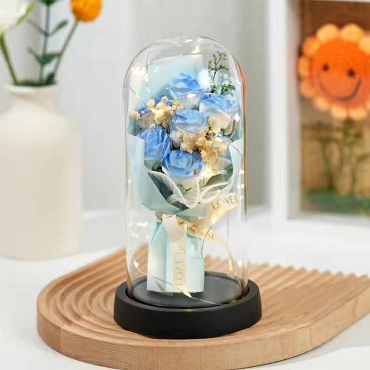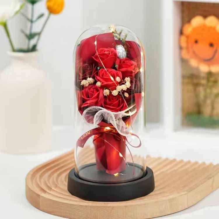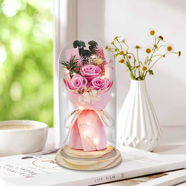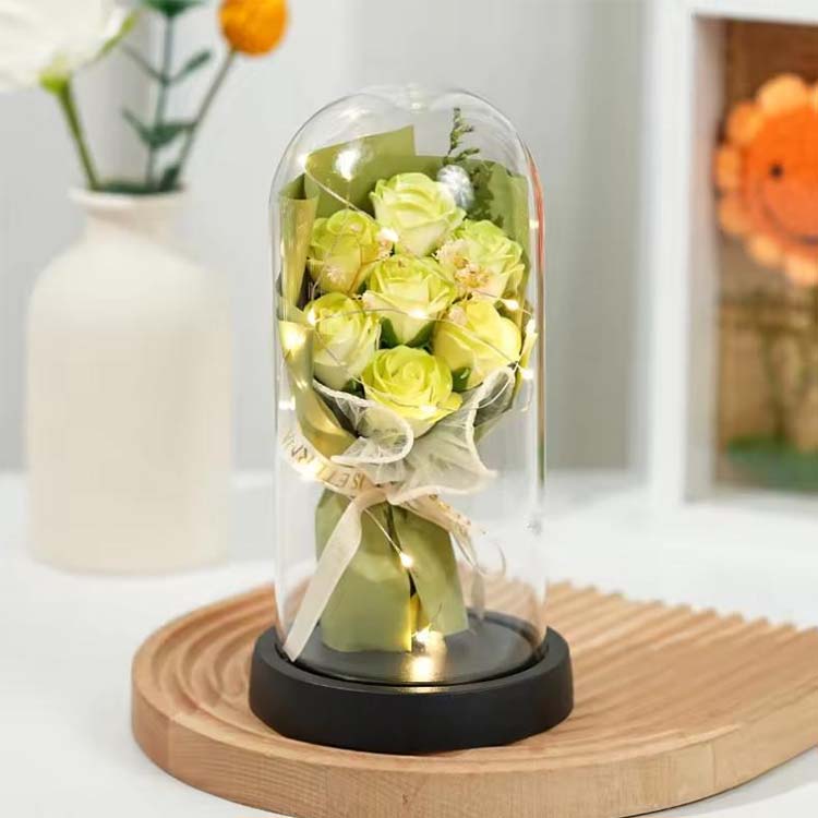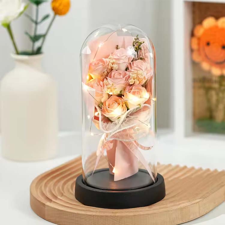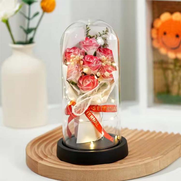 Buket mawar sabun kubah kaca dengan LED digunakan dalam kombinasi dengan bunga sabun dan bunga yang diawetkan. Lampu LED menggunakan cahaya yang hangat dan tidak silau, yang dapat menambah suasana hangat saat mendekorasi pemandangan. hadiah Bunga abadi tidak akan layu dan tidak berubah warna meskipun dengan penutup kaca. Bunga sabun juga bisa digunakan untuk mencuci tangan atau sebagai pewangi. Buket mawar ini ekonomis dan praktis.