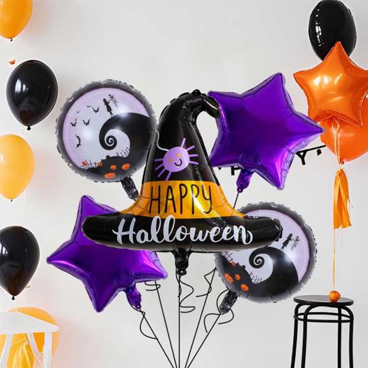 Set lima potong Halloween adalah set balon yang dirancang khusus untuk Halloween. Biasanya terdiri dari balon foil, balon lateks, dan aksesoris lainnya. Ini mencakup total lima jenis balon! Setiap set menampilkan pola atau karakter yang sangat cocok dengan tema Halloween. Sempurna untuk dekorasi Halloween, Anda bahkan dapat mengisi balon dengan helium untuk membuatnya melayang! Ini benar-benar menambah suasana misterius Halloween!