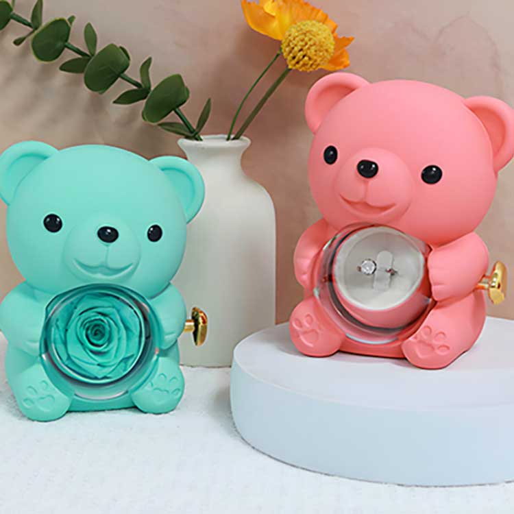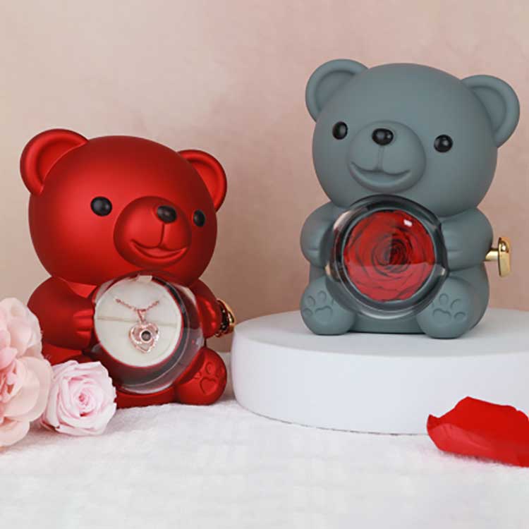 Kotak perhiasan Hug Bear Rose ini digunakan untuk dipajang di meja, rak buku, atau meja samping tempat tidur. Fitur yang paling menarik perhatian adalah bunga mawar yang diawetkan di tengahnya. Membuka mawar memperlihatkan kompartemen untuk menyimpan perhiasan, cincin, atau kenang-kenangan.
