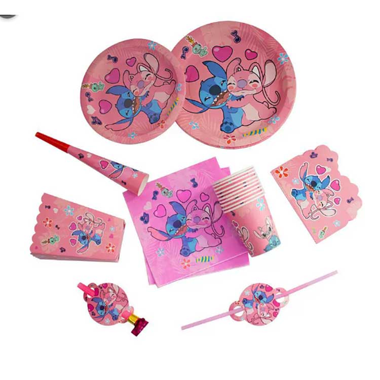 Set piring sekali pakai Stitch mencakup produk-produk berikut: piring 7 inci (10 buah/tas), piring 9 inci (10 buah/tas), serbet (20 buah/tas), panji (10 buah/tas), tas kado pengembalian (10 buah/tas), kotak popcorn (6 buah/tas), naga tiup (6 buah/tas), topi kertas (6 buah/tas), cangkir kertas (10 buah/tas), tanduk (6 buah/tas), sedotan (10 buah/tas), kartu undangan (10pcs/tas), masker (10pcs/tas), sendok, alat makan (10pcs/tas), dan taplak meja (1pc/tas). Set berisi 17 jenis produk berbeda. Pelanggan dapat memilih untuk membeli seluruh set atau memilih hanya sebagian item untuk memenuhi kebutuhan mereka.