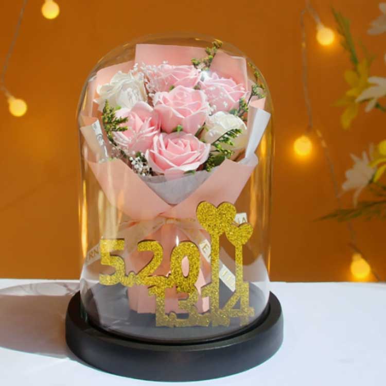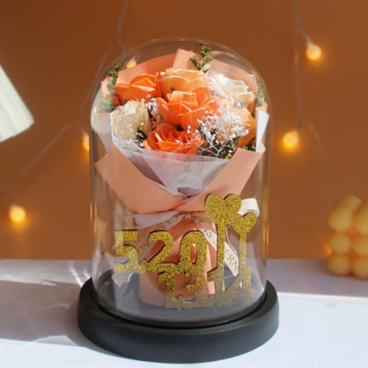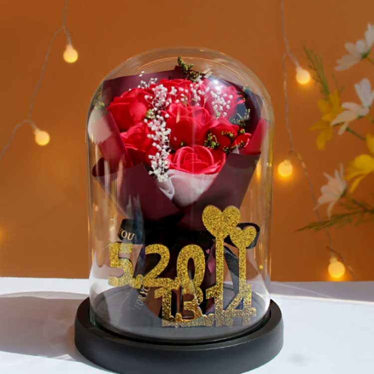 Buket mawar kaca ini dirancang untuk mencegah bunga layu, dan bunga mawar di dalamnya tidak pudar. Buketnya sangat hidup, hampir bisa dibedakan dengan bunga asli, dan dapat menghadirkan keindahan karangan bunga dengan sangat baik. Di dalamnya, angka emas 520+1314 mewakili angka 520 dan 1314, melambangkan cinta dan menonjolkan perhatian dari hadiah ini.